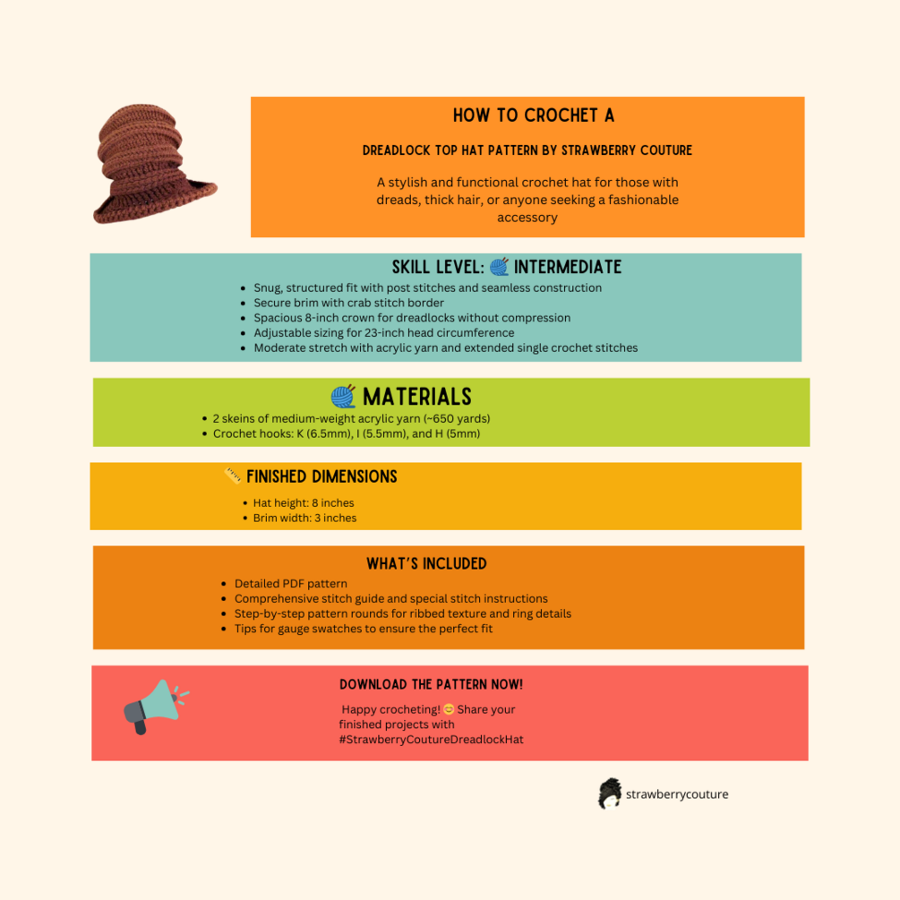 Attention crocheters worldwide! Step into the world of stylish and functional crochet with this Dreadlock Top Hat Pattern, designed for those with dreads, thick hair, or anyone seeking a fashionable and structured hat. This intermediate-level pattern by Strawberry Couture seamlessly combines style and practicality, guiding you through the process of creating a textured crochet hat that's perfect for everyday wear or special occasions.
